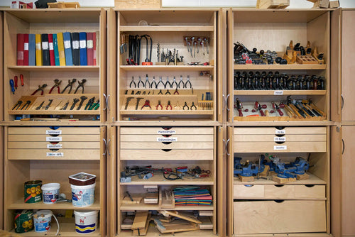 Unsere Aufbewahrungsschränke finden sich in Werkstätten, Tischlereien und vor allem in Werkräumen in Schulen und Kindergärten. Unsere Schränke sind multifunktionell und können individuell eingerichtet werden – so können Sie sich eine perfekt auf Ihre Bedürfnisse abgestimmte Aufbewahrungslösung zusammenstellen. Wenn das Grundelement erst einmal steht, können Sie die Inneneinrichtung immer wieder umgestalten, wenn sich Ihre Anforderungen ändern. Hier finden Sie Schubladen, Regalböden, clevere Einteilungen und Fächer, die für Ordnung sorgen: So sind Ihre Materialien, Gerätschaften, Werkzeuge und Maschinen immer übersichtlich aufbewahrt. Die Türen sind mit Zylinderschlösser und Scharnieren für versenkbare Türen ausgestattet. Dadurch lassen sich die Türen nach dem Aufklappen in einen Zwischenraum an den Außenwänden des Schranks schieben. So wird Platz gespart und die Türen ragen nicht in den Raum.